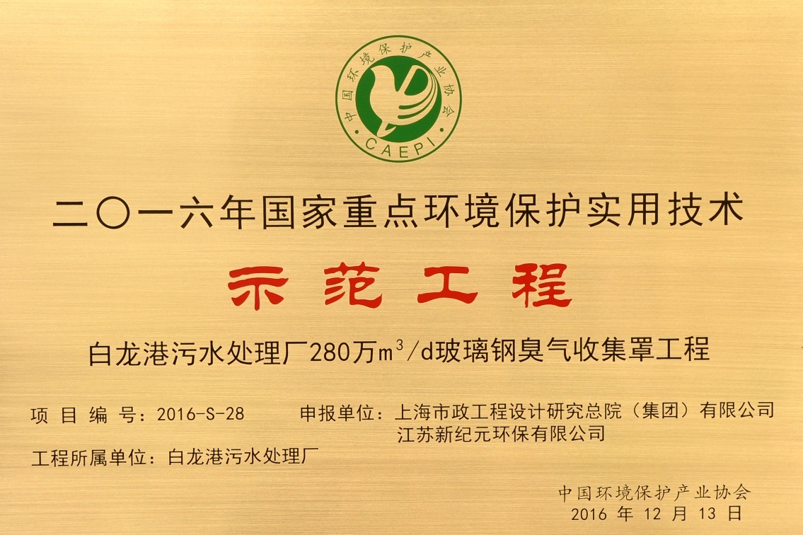 针对本项目特点、难点,我公司和上海市政设计院共同攻关,采用了包括无骨架大跨度低净空轻型除臭罩、臭气收集风量平衡指示及控制系统、超高效智能型复合式除臭一体化设备等,解决了本项目从加盖收集、负压吸引、达标处理等一系列难题,将污水厂废气排放标准由目前的厂界二级提升到厂界一级。该项目被评为2016年度“国家重点环境?;な涤眉际跫笆痉豆こ獭?。
